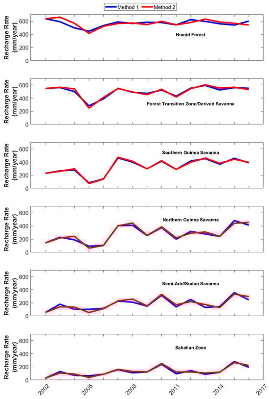 Methods 1 and 2 used here produce almost similar results and trends in each location, indicating consistency. However, Method 2, which accounts for ongoing discharge, tends to estimate slightly higher recharge rates in regions experiencing greater groundwater variability (e.g., Forest Transition Zone and Northern Guinea Savanna). This suggests that Method 2 may capture additional recharge dynamics due to human or environmental factors, providing a more liberal estimate of recharge. Rodell et al. [65] compared different methods for estimating recharge, noting that methods accounting for dynamic factors like groundwater discharge can lead to higher estimates of recharge in regions with fluctuating groundwater conditions. Fluctuations in recharge rates, particularly during 2008–2015, could correspond to changes in rainfall patterns, especially in the savanna and Sahelian regions, with episodes of drought in the intervals 2002–2004 and 2011–2013. Anthropogenic activities such as groundwater withdrawal could also contribute. Recharge rates in the IND appear to be relatively low. This could raise some concerns about eventual groundwater sustainability, like in other semi-arid and arid areas [66].