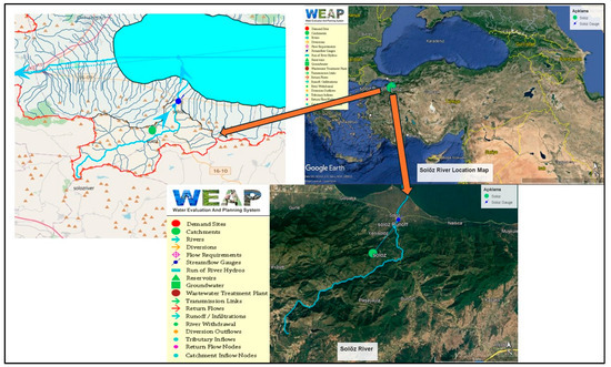 Selek and Aslan [18] introduced the WEAP program in their study as follows. WEAP software aims to efficiently plan basin water hydrology in integrated water resource management. Thanks to the program, water budgets can be calculated according to various scenarios by entering existing basin information into the program so that management analysis can be performed. Within this study, we plan to calculate the water budget with different models, as well as to calculate the water budget with the WEAP model, compare the results, and validate the model.