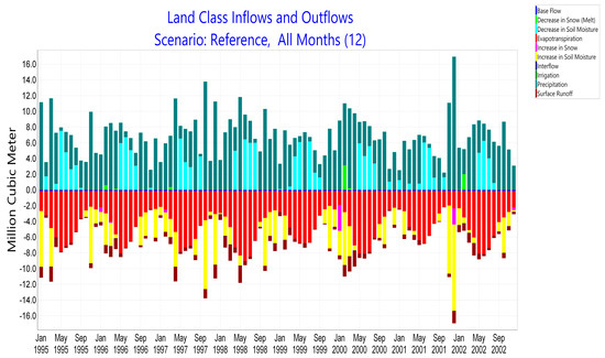 For the Solöz Basin, the basin water budget was calculated between 1995 and 2002. The aim of this study was to test the accuracy of the model results with calibration results from streams without source measurements in the Lake Iznik basin. Since the DSI source measurements in Soloz Stream were made between 1995 and 2002, the model results were prepared according to the data between these dates to verify the model results. The obtained water budget varies according to the years. However, it is seen that it shows a reasonable and logical distribution for many parameters such as precipitation, evaporation, and decrease in soil moisture, as shown in Figure 2. The inflows to the basin consist of precipitation, decrease in soil moisture, decrease in snow melt, and increase in snow, increase in soil moisture, evaporation, surface runoff, and intermediate flows, which can also be expressed as outflows from the basin, as seen as minus at the bottom of the graph. The detailed water budget components created for the Soloz Basin and the total water budget change over the years are as shown in Table 1.