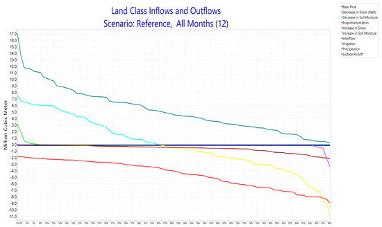 When looking at the inflow and outflow flows of the model area class, it was observed that the graph shows a uniform distribution, and the inflow flows to the river water budget are located in the upper part of the graph, while the outflow flows are located in the lower part of the graph and are (−). According to the flow continuity curve, the inlet and outlet flows were analyzed separately 90% of the time.