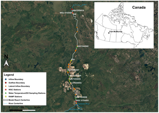 The model used in this study was built in the MIKE HYDRO River [20], which consists of 204 cross-sections, with each cross-section at approximately 1 km intervals. The model incorporates a total of 28 boundary conditions, including an inflow boundary located approximately 3 km upstream of the confluence of the Athabasca and Clearwater Rivers, 26 lateral inflow boundaries representing tributaries along the selected study reach, and an outflow boundary at the downstream end, as shown in Figure 1. All boundary conditions are input as a time series of discharge values except a constant value at the outflow boundary. The water quality data were obtained from the Canada–Alberta Joint Oil Sands Environmental Monitoring Information Portal (JOSMP) dataset [36]. Flow and water level data were obtained from Water Survey of Canada (WSC) station 07DA001 (Athabasca River below Fort McMurray), as well as Regional Aquatics Monitoring Program (RAMP) stations S24 (Athabasca River below Eymundson Creek) and S46 (Athabasca River near the Embarras Airport) [37]. Observed water temperature and dissolved oxygen (DO) concentrations were extracted from 7 stations within the JOSMP dataset and Alberta’s river water quality monitoring program (WQP) dataset [38]. These stations are designated as water temperature/DO sampling sites in Figure 1.
