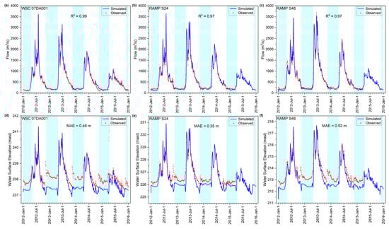 Figure 2 presents the calibration and validation results for flow (m3/s) and water level (WSE, meters above sea level [masl]) at three stations with observed data, WSC 07DA001, RAMP S24, and S46, from 2012 to 2016. The blue shading represents ice-covered periods (the same for the following figures). The ice-covered period for each year was specified based on the dates when the gauge was affected by ice [43].