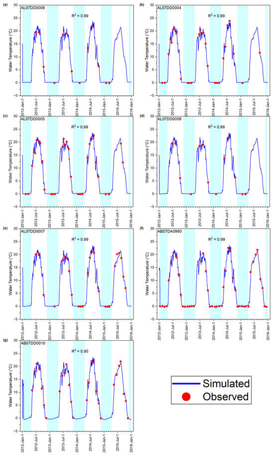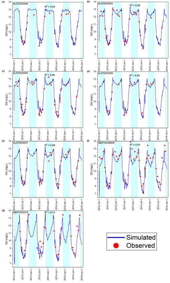 The R2 values are above 0.90 for the upstream 5 stations, while the last 2 stations fit less, with R2 values of 0.83 and 0.74. At station AB07DA0980 (Figure 4f), the model consistently underestimated winter DO concentrations in the calibration period (2012–2014). This station, located 123 km downstream of the inflow boundary near the confluence of the Athabasca River and the Firebag River, exhibited slightly higher observed DO concentrations than other stations. The model also slightly underestimated DO at station AB07DD0010 (Figure 4g), which is close to the outflow boundary. Nevertheless, the model was deemed as satisfying, given the high R2 values at all the stations.