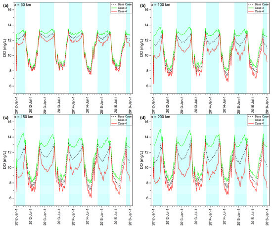DO concentration results of the base case, case 3: R20 = 1.0 and case 4: R20 = 5.0 at cross-sections (a) x = 50 km; (b) 100 km; (c) 150 km; and (d) 200 km from 2012 to 2016.