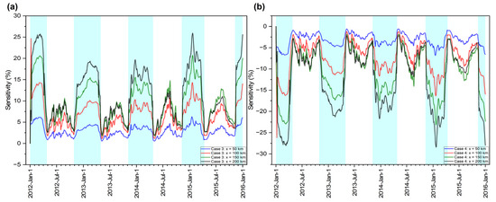 Sensitivity results of (a) case 3: R20 = 1.0 and (b) case 4: R20 = 5.0, at x = 50 km, 100 km, 150 km, and 200 km from 2012 to 2016.