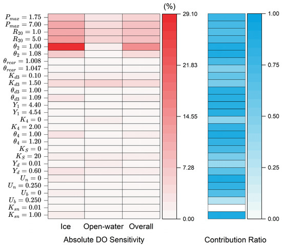 where ice represents the ice periods only and overall represents the overall time period. A value close to 1 indicates a more dominant ice-covered sensitivity compared to open-water sensitivity for the specific parameter. A higher contribution ratio indicates greater seasonal variation in DO sensitivity, reflecting a larger disparity in the contributions of ice-covered and open-water periods to overall sensitivity.