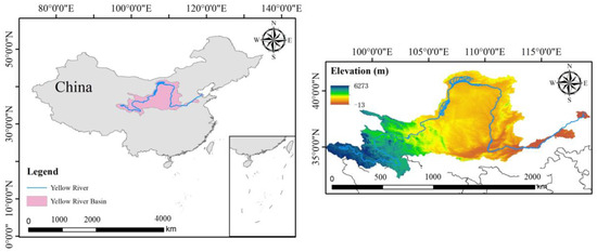 The YRB is the second-longest river in China, flowing through nine provinces and regions of Qinghai, Sichuan, Gansu, Ningxia, Inner Mongolia, Shanxi, Shaanxi, Henan, and Shandong, with a total length of about 5464 km and a watershed area of about 795,000 square kilometers [7,9]. The topography of the basin is high in the west and low in the east, spanning the three major geomorphic units of the Qinghai–Tibet Plateau, the Loess Plateau, and the North China Plain. The climate types are diverse, from the upper reaches of the high cold climate to the lower reaches of the temperate monsoon climate, and the precipitation distribution is uneven [10]. The YRB water resources have limited time and space distribution, the upstream water resources utilization rate is low, but the relatively abundant middle water loss and soil erosion is serious, and there is a contradiction between the supply and demand of downstream water sharp. There are various types of land resources, but the problems of soil erosion and land degradation are prominent in the Loess Plateau, while the downstream plain area is rich in cultivated land resources but faces the threat of salinization. In addition, the YRB is rich in energy resources, especially large reserves of coal, oil, and natural gas, but the development and utilization of energy has also brought ecological and environmental problems such as air pollution, water consumption, and carbon emission increase [11].