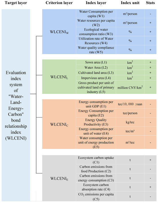 The establishment of the evaluation index system of “W-L-E-C” coupling-coordinated development is the key to studying the harmonious relationship between resource utilization and the ecological environment in the nine provinces of the YRB. Based on scientific, systematic, operational, and regional principles, the system covers the following four subsystems: water resources, land resources, and energy and carbon emissions; furthermore, it selects specific indicators such as water resources per capita, gross production per unit of cultivated land in the primary industry, water consumption per unit of energy, and carbon dioxide emissions per capita. This index system can not only evaluate the spatiotemporal evolution characteristics of the “W-L-E-C” system in the nine provinces of the YRB, but it can also identify key driving factors, providing a scientific basis and practical guidance for regional ecological protection and high-quality development [12,13,14,15,16]. The evaluation index system is shown in Figure 2.