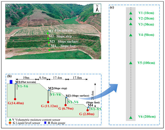 The detailed layout of the monitoring points is shown in Figure 2. In this research, monitoring data from the central line (M1–M4) were selected for analysis. M1–M4 were located at the flat terrain, slope step, slope surface, and slope foot, respectively.