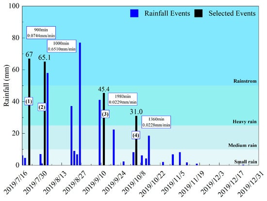 This study analyzes the monitoring data from 16 July 2019 to 31 December 2019. During this period, 27 rainfall events directly influenced the soil moisture at a depth of 10 cm, with a cumulative rainfall amount of 539.0 mm, accounting for 73.6% of the annual rainfall (732.4 mm). The rainfall pattern was characterized by abundant rainfall in summer and autumn and low precipitation in winter (Figure 3). According to the Chinese Meteorological Industry Standard Grade of Rainfall Processes (QX/T 489-2019) [48], these rainfall events were categorized based on their magnitudes. Independent rainfall events were identified based on the criterion that no other rainfall occurred the day before or after the event.