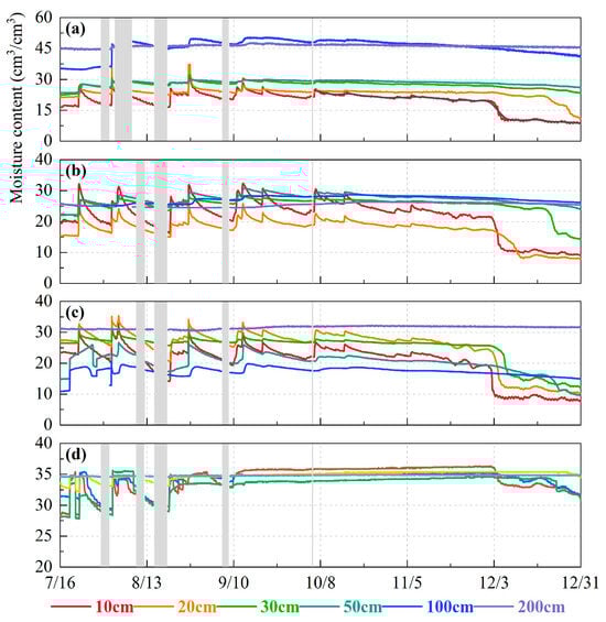 Soil moisture spatial dynamics at different monitoring points. (a) M1, (b) M2, (c) M3, (d) M4. Gray interruptions are missing monitoring values.
