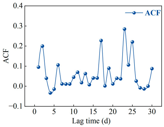 Based on Equation (1), the autocorrelation of both the rainfall and soil moisture sequences was analyzed, and the results are shown in Figure 5 and Figure 6, respectively. Figure 5 illustrates the autocorrelation of the rainfall sequence at the daily scale. It can be observed that the rainfall sequence exhibits high randomness, meaning that rainfall events are independent and previous rainfall does not correlate with subsequent rainfall. As shown in Figure 6, at different slope positions, the ACF of the soil moisture time series decreases with the depth. This trend suggests that soil moisture movement is a long-term and slow process, with the previous soil moisture conditions significantly influencing subsequent changes. Additionally, it can be observed that the ACF decays most rapidly in the 10 cm and 20 cm soil layers, followed by the 30 cm and 50 cm layers, while the 100 cm and 200 cm layers exhibit the slowest decay rates. This indicates that shallow soil moisture is more affected by external factors and has a weaker self-memory effect, whereas deeper soil moisture is relatively less stable. Therefore, the autocorrelation of rainfall events is not significant, whereas soil moisture shows a high degree of autocorrelation.