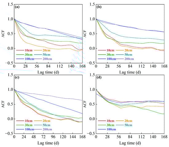 Autocorrelation analysis of soil moisture during the research period. (a) M1, (b) M2, (c) M3, (d) M4.
