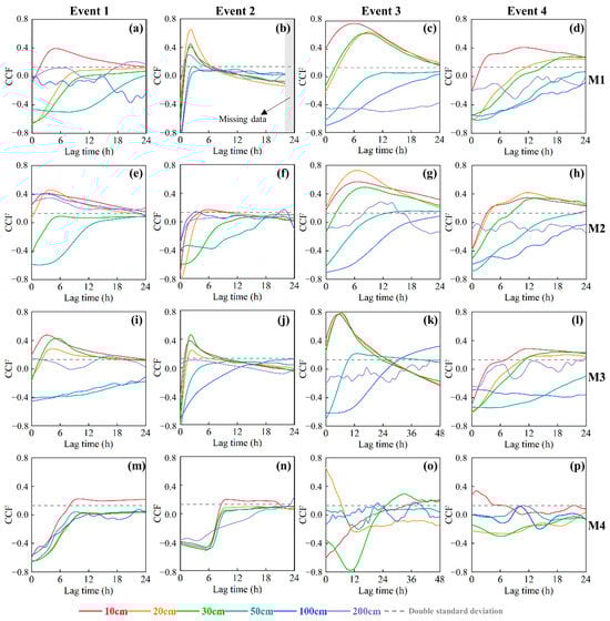 (a–p) Cross-correlation analysis of rainfall and soil moisture. Each row represents a different monitoring location, M1–M4, and each column represents a selected rainfall event, Event 1–Event 4. For example, (a) shows the CCF between soil moisture and rainfall at different depths of M1 in Event 1.