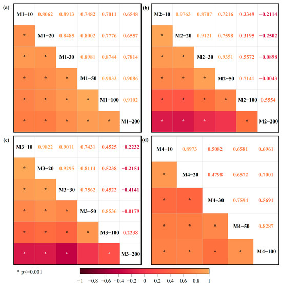 Spearman’s rank correlation coefficients of moisture content among (a) M1, (b) M2, (c) M3, and (d) M4. For example, 0.806 in (a) is the Spearman’s rank correlation coefficient of the soil moisture series at 10 cm and 20 cm depths during the monitoring period.