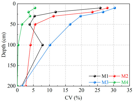 The soil moisture dynamics at different depths of each monitoring point during the study period are shown in Figure 4. A statistical analysis of the soil moisture data collected during the research period is summarized in Table 3. The mean soil moisture content at different monitoring points ranged from 7.42 to 50.46 cm3/cm3. The CV ranged from 0.22% to 30.36%, which indicates weak to moderate variability. The CV exhibited a decreasing trend along the vertical profile, suggesting a negative correlation between the CV and soil depth. Shallow soil moisture is more susceptible to rainfall, the temperature, and evapotranspiration, resulting in more active water movement. This effect gradually weakens with increasing depths, and the moisture dynamics become more even.
