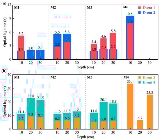Furthermore, the cross-correlation between rainfall and soil moisture across different monitoring points exhibits similarity. The response pattern of the 10–30 cm soil moisture to the selected rainfall events typically shows a single peak, with the response weakening after reaching the peak CCF. Given that the rainfall response of soil moisture is concentrated at a depth of 10–30 cm, the time interval between rainfall onset and the peak of the cross-correlation coefficient (CCF) between soil moisture and rainfall is defined as the PLT to quantitatively analyze the response time of soil moisture under different rainfall conditions. The results are summarized in Table 4. The data indicate that the PLT is also depth-dependent on an hourly scale, showing an increasing trend with the depth, and varies across different slope positions. Therefore, it is essential to consider the depth and slope position when selecting the best observation time for soil moisture after rainfall.