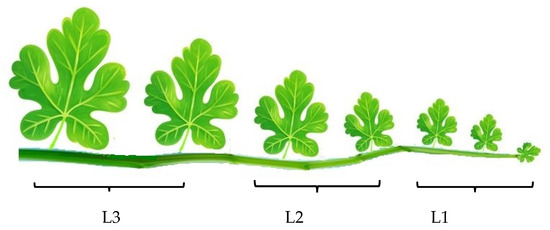 Leaves of watermelon plants were classified into three categories based on their positions: upper (L1), middle (L2), and lower (L3). For each treatment, a total of 80 leaves were collected and measured. The specific definitions of these leaf positions are depicted in Figure 1, where leaves are arranged from top to bottom in the order of their growth sequence. Specifically, L1 (upper) refers to leaves located at the top 1/3 of the plant height, L2 (middle) at the midpoint (1/2), and L3 (lower) at the 2/3 point from the top leaves to the bottom leaves.