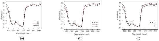 Under the T1, T2 and T3 treatment, the spectral curves are shown in Figure 4a–c. Variation patterns of leaf reflectance across different leaf layers were observed. The reflectance changes from 700 nm to 1100 nm exhibited a similar trend, with the following order of L1 < L2 < L3. Under T1 and T2 treatments, the reflectance values of L1, L2, and L3 in the 700–1000 nm range exhibited some differences across the three layers. However, under the T3 treatment, the reflectance differences between L1 and L2 were minimal. Under all drought treatments, L2 showed minor differences in reflectance within the 500–600 nm range compared to both L1 and L3.