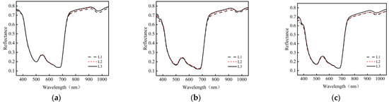 This study selected 350 nm to 1100 nm wavelengths to analyze the changes in hyperspectral reflectance under different drought treatments. Watermelon leaves with varying water content across different leaf layers were selected for spectral analysis. The mean spectral reflectance of all samples at different layers (L1, L2, and L3) and the spectral reflectance of watermelon under varying water content are presented in Figure 3a–c. For the same leaf layer, the spectral reflectance of watermelon slightly increased in the near-infrared bands as water content increased. The spectral reflectance of watermelon with the highest water content was the greatest in the near-infrared region.