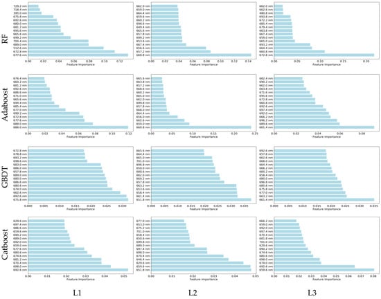 Figure 5 illustrates the top 15 bands in terms of feature importance ranking from L1, L2, and L3 based on four algorithms. Among all the models, the AdaBoost-L2 model exhibited the highest feature impact with a value of 0.2407 at the wavelength of 660.8 nm. The RF-L3 model ranked second, achieving a feature importance score of 0.2175 at the wavelength of 672.8 nm. All other models had a feature impact below 0.2. This indicates that the wavelengths of 660.8 nm and 672.8 nm played a crucial role in the precision of the models.