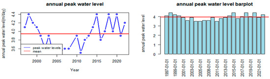 The results of statistical tests conducted on the extracted annual peak water level data indicate a rejection of the alternative hypothesis () in each test (Table 3). Given that if the p-value is greater than 0.05, the null hypothesis () is accepted, this outcome implies homogeneity, independence, and stationarity among the annual peak water levels.