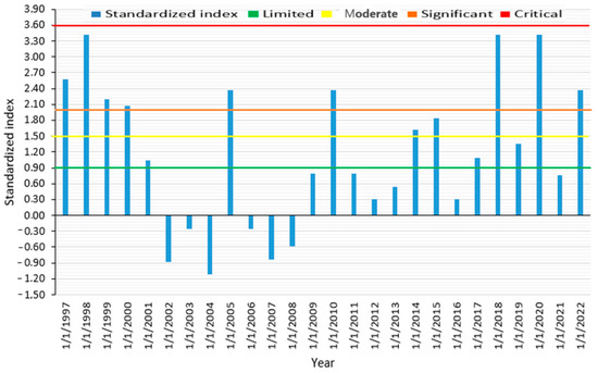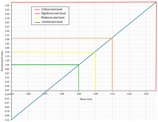 where is the water level index, is the observed annual maximum value, is the mean of the annual peak water level values, and is the standard deviation of the annual water level peaks values. The different hazard categories, limited, moderate, significant, and critical, are shown in Table 1.