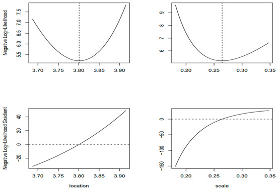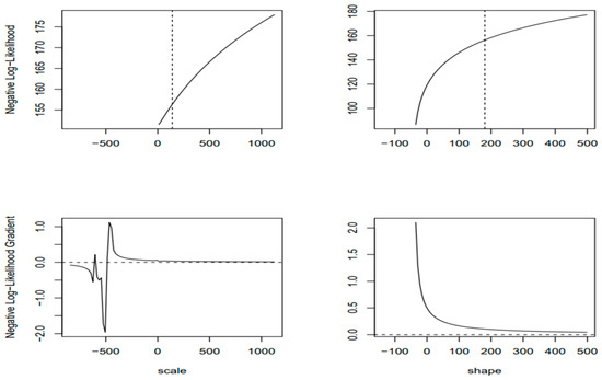 The experimental probabilities associated with the observations were calculated using Weibull’s empirical formula, as shown in Equation (2), which aims to obtain unbiased exceedance probabilities for all distributions [39]. After ranking the sample of annual maximum daily water levels of size in ascending order, the expression for Weibull’s empirical or experimental exceedance frequency for a value of rank is given in Equation (5):