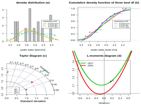 Performance of distributions in frequency analysis of annual peak water level of Nokoue lake: (a) probability density function; (b) cumulative distribution function; (c) Taylor diagram; and (d) L-moment diagram.