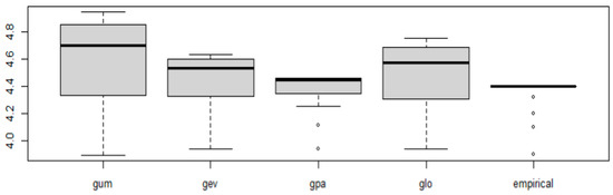 For the preliminary determination of flood quantiles at extreme frequencies and the return period (RP) of the reference flood, the three best distributions were selected based on their superior performance in the model selection tests (Table 5 and Table 6). The Gumbel distribution appears to fit the tail of the distribution better. For exceedance probabilities ranging from 0.85 to 0.01, the quantiles estimated with the Gumbel distribution closely approximate the empirical quantiles (Table 5). The quantiles associated with return periods (RP) of 2, 3, 5, 6, 7, 8, 9, 10, 15, 20, 25, 30, 35, 40, 45, 50, 55, 60, 65, 70, 75, 80, 85, 90, 95, and 100 years are provided in Table 6. The reference flood for the Nokoue lake station is the highest recorded quantile value, corresponding to 5.05 m/day with the Gumbel distribution, with an associated return period of 150 years. This implies that the reference flood has a 0.66% chance of occurring or being exceeded annually. The annual peak water level for the 100-year return period is 4.95 m/day. The box plot (Figure 11) shows that most of the annual peak water levels of Nokoue lake estimated with the Gumbel distribution are below the mean.