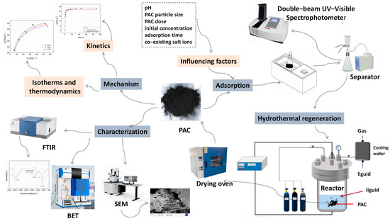 Figure 1 shows the complete flow schematic of the experiment. The PAC used in this experiment was prepared from lignite coal. During the one-step method of charring activation, O2/CO2/H2O was used as the reaction atmosphere. The specific preparation method for PAC has been described in the literature [11,12,13].