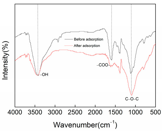 As shown in Figure 2, a number of adsorption peaks were detected, which could be attributed to various functional groups, such as oxygen-containing and nitrogen-containing functional groups, which usually occupy the main active sites on the surface of the original activated coke. PAC exhibited strong absorption peaks at 1580 cm−1 and 1396 cm−1, attributed to the COO- stretching vibration; the bands at 1110 cm−1 and 3420 cm−1 were attributed to C-O-C and -OH stretching of adsorbed water molecules, while the weak bands at 2936 cm−1 and 780 cm−1 were attributed to the presence of methyl, methylene, and other side chains [34,35]. After adsorption, PAC had a weaker absorption peak at 1580 cm−1 than that of the original PAC, indicating a significant decrease in the COO- stretching vibration. This change suggests that phenol chemically reacted with COO- on the surface of the activated coke during the adsorption process [36].