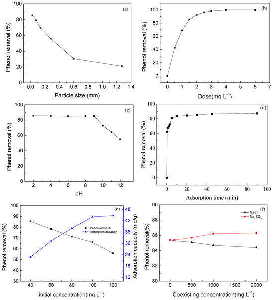 Figure 5a shows the effect of PAC particle size on the adsorption of phenol. Clearly, the amount of adsorbed phenol increased significantly with a decrease in the particle size of PAC. The amount of phenol adsorbed using PAC (<61 μm) was approximately five times greater than that adsorbed by PAC with particle sizes between 1180 and 1400 μm. This is due to the increased specific surface area and pore volume of smaller PAC particles, which also effectively shortens the internal diffusion distance, reduces the internal diffusion resistance, and accelerates the mass transfer process, thus causing an increase in adsorption capacity [39,40].