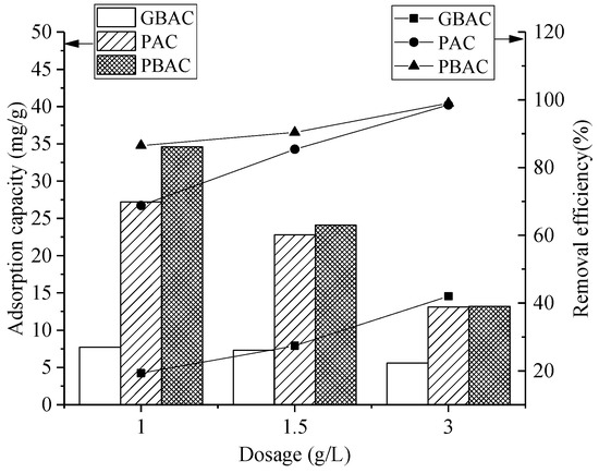 A comparison of the phenol adsorption effects between PAC and commercial biological activated carbon produced by coconut shell is shown in Figure 6. The maximum adsorption capacities of GBAC (granular biological activated carbon, 2000 μm~4000 μm), PAC (<61 μm), and PBAC (powdered biological activated carbon, <61 μm) in the experiments were 7.72, 24.0, and 34.6 mg g−1, respectively [46,47]. Even when the dose was increased to 5 g L−1 for GBAC, the removal efficiency was only 73%. The removal efficiency for 1.5 g L−1 PAC was almost the same as that for 1 g L−1 PBAC. The price of PAC is one-third that of PBAC. The low cost of PAC is due to the low price of lignite as a raw material and the simplification of the production process to avoid energy waste. Therefore, it is suitable to replace commercially available activated carbon with PAC.