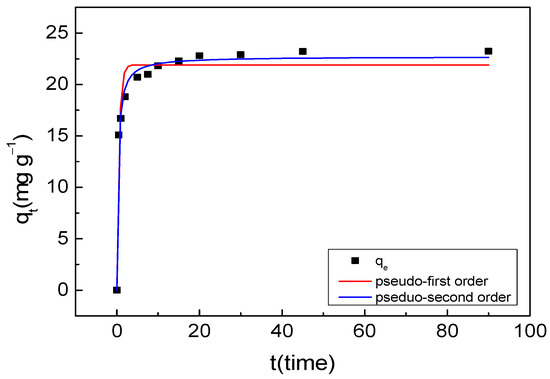 If the adsorption process is mainly influenced by liquid film diffusion, it should be consistent with the pseudo-first-order model and can be used to calculate the adsorption rate. The pseudo-second-order model is considered a chemical reaction.