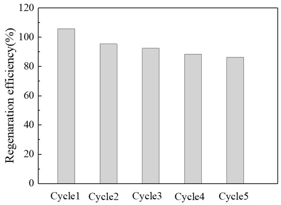 where Re represents the regeneration efficiency (%); qt is the amount of phenol adsorbed by the initial activated coke (mg g−1); qtn represents the amount of phenol adsorbed by the n-th regenerated active coke (mg g−1), and n is taken as 1, 2, 3, 4, and 5.