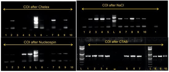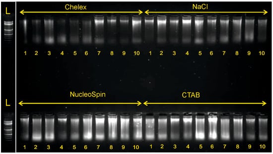 The qualitative and semi-quantitative analysis of genomic DNA indicated that the CTAB protocol and Nucleospin kit were the most effective for extracting high-molecular-weight DNA across the samples. However, the NaCl protocol showed less DNA degradation. Chelex-100 extraction results were not consistent amongst samples. L: 100 bp DNA Ladder (New England Biolabs, Ipswich, MA, USA).
