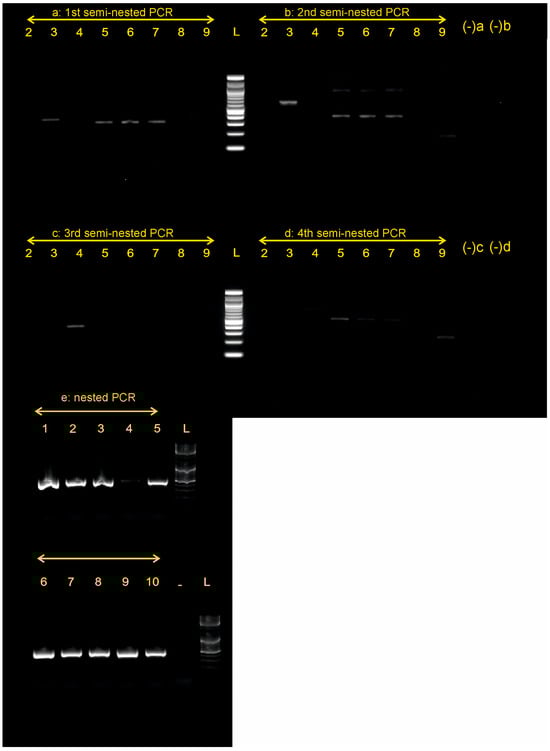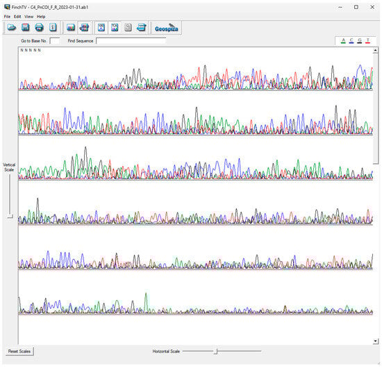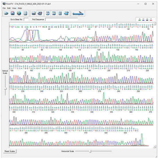 Due to suboptimal and contaminated sequencing results characterized by weak signal intensity, overlapping peaks, and ambiguous base calls (see Results), novel internal primers targeting the COI fragment (PnCOI_F_MK22 and PnCOI_R_MK22) were designed [18] using Primer-Blast from GenBank https://www.ncbi.nlm.nih.gov/tools/primer-blast/ (accessed on 1 May 2022). Additionally, two other primer sets previously suggested in the literature were also tested [17,38]. A semi-nested PCR approach was subsequently adopted; 1 μL of DNA from the best initial PCR with LCO1490 and HCO2198 primers was used as a template for a second amplification round using primer combinations of forward PnCOI_F_MK22 and reverse primers from each primer pair. The efficacy of primers PnCOI_F_MK22 and PnCOI_R_MK22 was further evaluated through nested PCR protocols. All primers utilized in this study and their specific combinations in the PCR assays are summarized in Table 1 and Table 2, respectively.