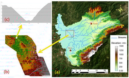 (a) Digital elevation model (DEM) for HEC-HMS, (b) for HEC-RAS, (c) for river bathymetry.