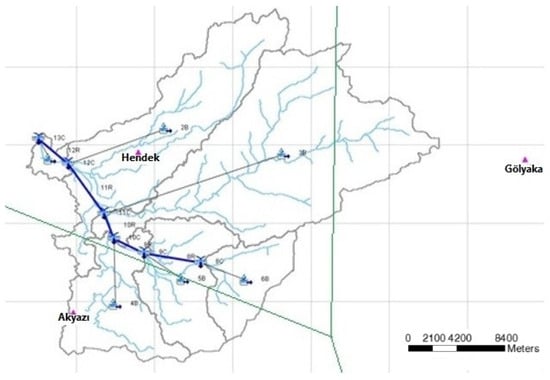 The Sakarya Basin is one of the 25 hydrological basins in Türkiye. It is located between latitude 37°96′–41°20′ north and longitude 29°26′–33°24′ east. The drainage basin area covers 58,160 km2, accounting for about 7% of the land area of Türkiye. The distance between the ends of the basin boundary is approximately 378 km in the north–southeast direction and 340 km in the east–west direction. The Sakarya Basin has a mean slope of approximately 0.78. The basin is completely filled with river sediments and today a large part of it is agricultural land [41]. Figure 2 shows the Dinsiz Stream basin and the location of this study.