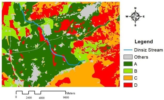 This value could not be obtained from previous studies in this region. Therefore, within the scope of this study, the CN value was manually calculated and assessed with the help of GIS-based programs [55]. The areas were determined by overlapping the hydrological soil group maps and the land use maps produced by the Ministry of Agriculture and Forestry of the Republic of Türkiye for the spring months of 2022, as shown in Figure 5. Then, the units corresponding to these areas (A, B, C, and D) were multiplied by the values in the table of hydrological soil group types. The hydrological soil group map of the location is presented in Figure 6. The calculations were performed, and the CN coefficient was found to be 70.