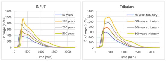 Finally, we created an additional model to validate the eight models. The flow data used for this model were obtained from the flood experienced in the region in July 2021. Using the 24 h rainfall values from this flood, a flow hydrograph was constructed and used in the model. The results of this flood event in July 2021 corresponded to a 100-year return period flood flow according to the coupled 1D/2D model and a 500-year return period flood according to the 2D model. This increased the accuracy of the results obtained using these models. Figure 11 shows the hydrograph results of the flood event.