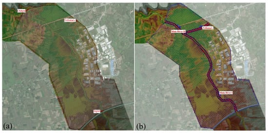 First of all, to create a 2D model, geometry, unsteady flow data, and plan files are required. Subsequently, the terrain data and Manning’s roughness layer must be correlated with the Geometry file [21]. Here, the land use map was used differently from the coupled 1D/2D model. For the defined 2D areas, 10 × 10 was chosen considering the calculation cell size, the accuracy of the model results, and the model runtime. Boundary conditions (input, tributary, and output) were then plotted to add unsteady flow data. The boundary conditions and the 2D model area chosen for this study are illustrated in Figure 9a.