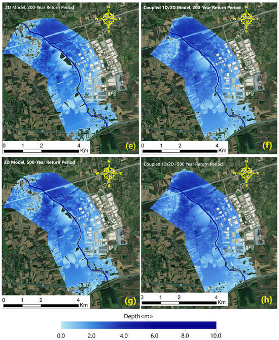 Flood inundation maps: (a) 50-year 2D model, (b) 50-year 1D/2D coupled model, (c) 100-year 2D model, (d) 100-year 1D/2D coupled model, (e) 200-year 2D model, (f) 200-year 1D/2D coupled model, (g) 500-year 2D model, (h) 500-year 1D/2D coupled model.
