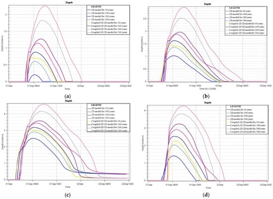 (a) Depth–time plot of all models for water depth in the flat area, (b) depth–time plot of all models for water depth in the industrial zone, (c) depth–time plot of all models for water depth to the right of tributary, (d) depth–time plot of all models for water depth for a point downstream.