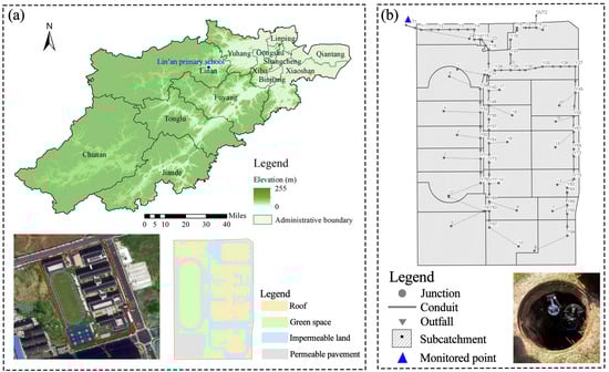 The study area is located in the Lin’an District of Hangzhou, Zhejiang Province, China (Figure 2a). The region experiences a subtropical monsoon climate with an average annual temperature of 17.8 °C. The rainy reason mainly occurs from May to September with an average annual rainfall of 1453 mm. The study area is a sponge city construction project covering a total area of 3.31 ha. The land use type is a primary school with an impervious surface ratio of 65.3% (Figure 2a). LID facilities have been established, encompassing the sunken greenbelt (SG) with an area of 1847 m2, vegetated swale (VS) with a length of 253 m, and permeable pavement (PP) covering an area of 6691 m2.