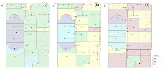 Different impervious area ratios of the study area: (a) 50%; (b) 65%; (c) 80%.