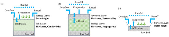 Schematic diagrams of LID facilities: (a) sunken greenbelt; (b) permeable pavement; (c) vegetated swale.