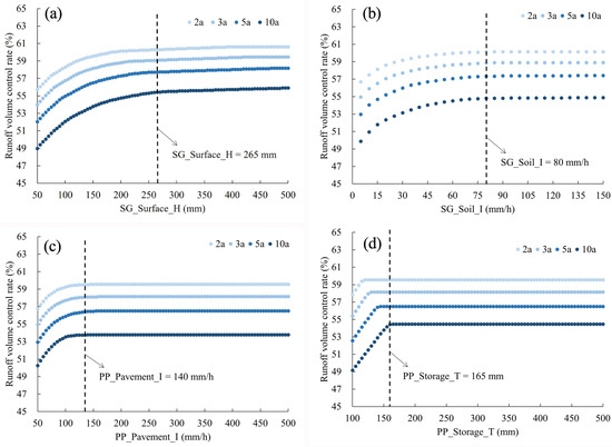 Effects of LID parameters on runoff volume control rate under different return periods: (a) SG_Surface_H; (b) SG_Soil_I; (c) PP_Pavement_I; (d) PP_Storage_T.