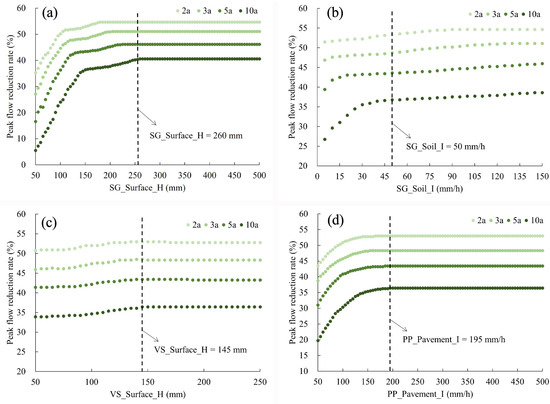 Effects of LID parameters on peak flow reduction rate under different return periods: (a) SG_Surface_H; (b) SG_Soil_I; (c) VS_Surface_H; (d) PP_Pavement_I.